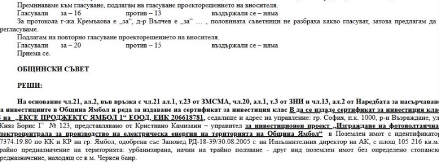 Георгиева – отр. вот – Искам да дам още два мотива за отрицателния вот по трите точки и конкретно по тази в момента. За пореден път ОА показва неуважение към работата и предложенията на Постоянните комисии в този ОбС. Член съм на ПК ЗОРПК, която направи едно много добре аргументирано предложение в духа на едно институционално взаимодействие между ОбС и Администрацията. Още веднъж г-н Ревански и неговия екип да огледат терена, да предложат своя визия, да преценят ефективността на ползване на тези площи, което не означава, че съответните фирми не могат да получат този сертификат, но за друга площ. Да се помисли дори за вариант има ли в следващи програмни периоди по планове за възстановяване и устойчивост, и други възможности за финансиране. Община Ямбол сама или в публично-частно партньорство да изгради собствен фотоволтаичен парк. И какво каза г-н Шиков, с цялото ми уважение към Вас: „Администрацията отхвърли предложението на комисията“. Смятам, че след като всички ние тук вдигаме ръка, предварително се събираме, за да дадем наистина едни целесъобразни предложения към нашия кмет към неговия екип, за да може града да върви по-добре. Това не означава, че след анализа може би нямаше да бъдат по-добре аргументирани тези предложения. Заради това, заради подценяване на мнението на ПК и по тази причина гласувах „против‘.