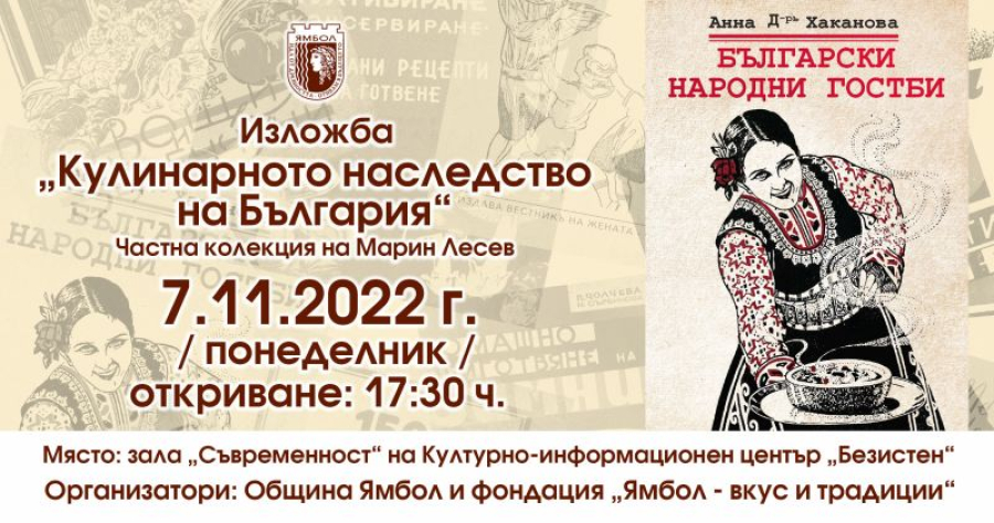 Община Ямбол и фондация „Ямбол – вкус и традиции“ организират първата в България изложба, наречена „Кулинарната история на България“, която ще бъде открита на 7 ноември, понеделник, в 17:30 часа.