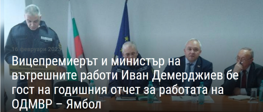 Директорът на ОДМВР-Ямол старши комисар Добрин Димитров представи годишния доклад за дейността на дирекцията през изминалата 2022 година в присъствието на министъра, заместник-министър Емил Ганчев и заместник-главния секретар на МВР главен комисар Станимир Станев. Сред официалните гости на отчета бяха областният управител на Ямболска област Георги Чалъков, председателят на Районен съд Светлана Митрушева, административният ръководител на Окръжна прокуратура Дойчин Дойчев, административният ръководител на Районна прокуратура Мина Грънчарова, кметът на Община Ямбол Валентин Ревански, кметът на Община Тунджа Георги Георгиев и зам.кметът на Община Стралджа Гроздан Иванов.