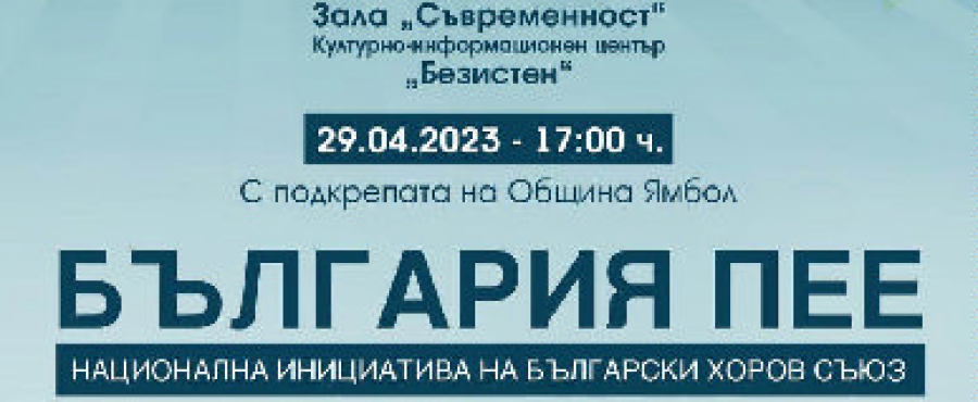 В 17:00 часа на 29 април, събота, ще започне концертът от VII Национална инициатива „България пее“ на Българския хоров съюз, организиран от Весела Пастърмаджиева, ръководител и диригент на Хорова школа „Проф. Георги Димитров“ – Ямбол, с подкрепата на Община Ямбол. Входът е свободен.