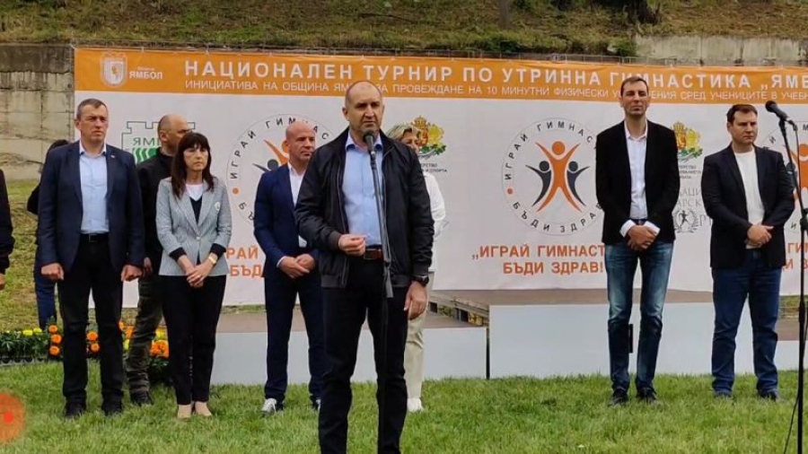 Държавният глава Румен Радев приветства участниците в Националния турнир по утринна гимнастика „Ямбол 23“ и в „Президентския тест“, част от инициативата „Спортувай с президента“.