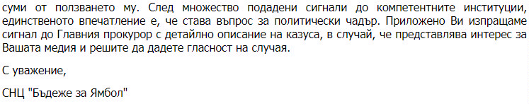 Сигналът е подписан от Георги Славов като председател на Сдружение с нестопанска цел "Бъдеще за Ямбол"