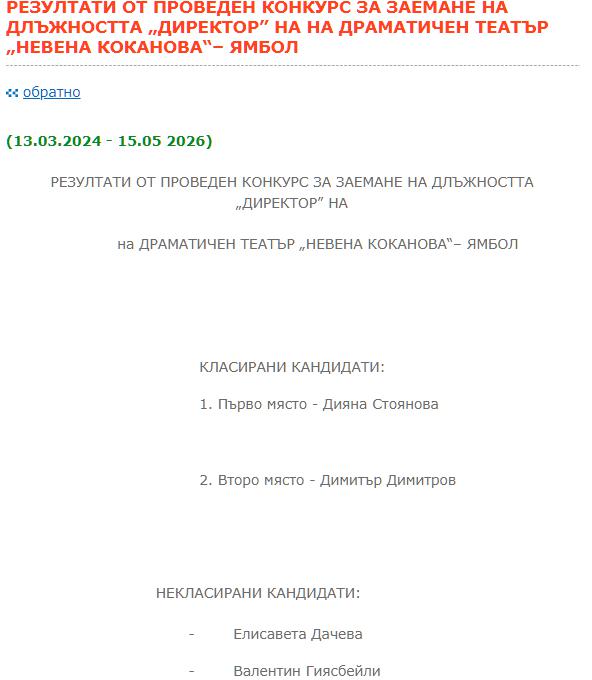 Всъщност едва на 13 март Министерството на културата публикува в сайта резултате Защо се е получило това информационно забавяне /или избързване/ не знаем, но...Но припомняме, че още при старта на конкурса се получи неприятност. Един от кандидатите, според първоначалното обявление, не беше допуснат до участие, но след обжалване от негова страна, все пак беше.