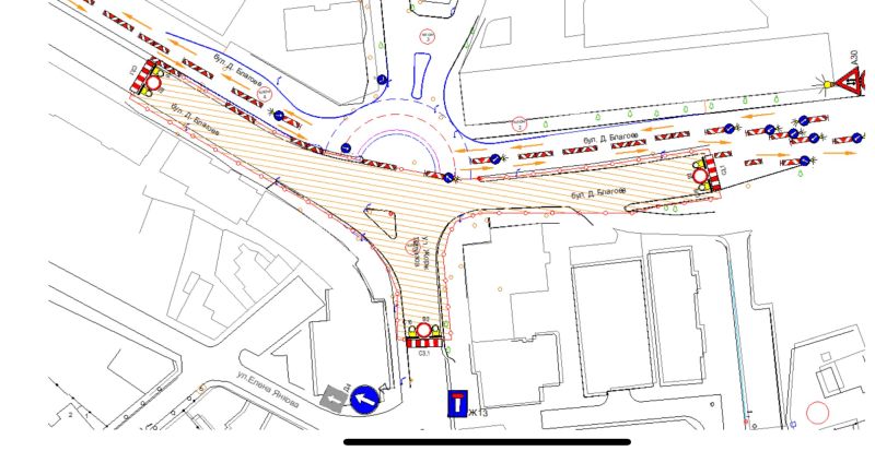 Въведена е временна организация на движението за южната част на новоизграждащото се кръгово кръстовище на ул. „Димитър Благоев“ и ул. „Жорж Папазов“ в Ямбол. По време на строителството е осигурен режим на автомобилно преминаване през кръстовището. За достъп до ул. „Димитър Благоев“ ще се използват обходни маршрути през ул. „Елена Янкова“ и ул. „Стилияна Параскевова“. Целта на организацията е да се оптимизират строително-ремонтните дейности, с оглед на максимално бързото изпълнение на проекта и улесняване на придвижването на шофьори и пешеходци в района.