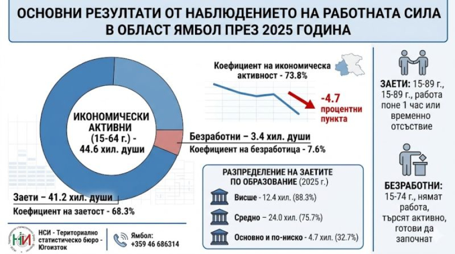 Данните за 2025 г. са категорични: Ямбол рискува да изпадне в икономическа летаргия, ако не намери начин да съживи пазара си на труда. Образованието остава единственият работещ лост за успех, но той не е достатъчен, ако 15 800 души остават икономически „изолирани“. Без целенасочени политики за активиране на жените и неактивните лица, регионът трудно ще затвори дистанцията до средните национални нива.