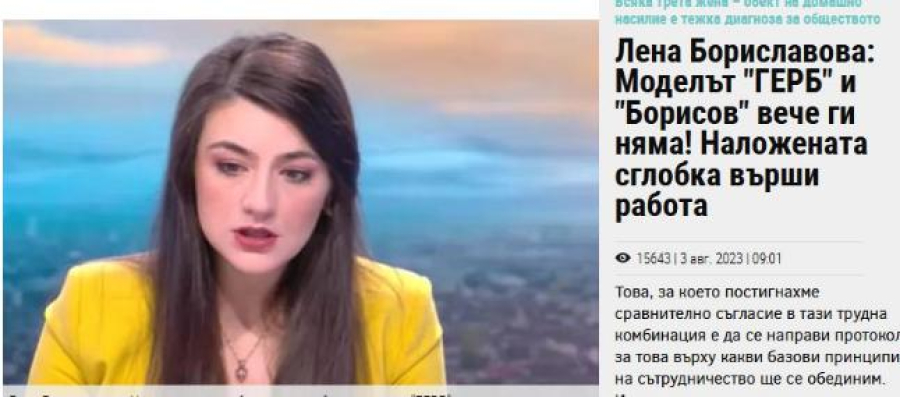 3 август 2023 година - Лена Бориславова отваря шампанско: "Моделът "ГЕРБ" и "Борисов" вече ги няма". "Нещата не функционират както преди", добавя триумфално тя.