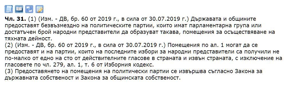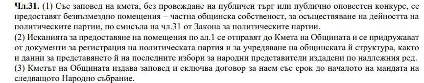 Чл.31. (1) Със заповед на кмета, без провеждане на публичен търг или публично оповестен конкурс, се предоставят безвъзмездно помещения – частна общинска собственост, за осъществяване на дейността на политическите партии, по смисъла на чл.31 от Закона за политическите партии. (2) Исканията за предоставяне на помещения по ал.1 се отправят до Кмета на Общината и се придружават от документи за регистрация на политическата партия и за учредяване на общинската й структура, както и данни за представянето й на последните избори за народни представители издадени по надлежния ред. (3) Кметът на Общината издава заповед и сключва договор за наем със срок до началото на мандата на следващото Народно събрание.