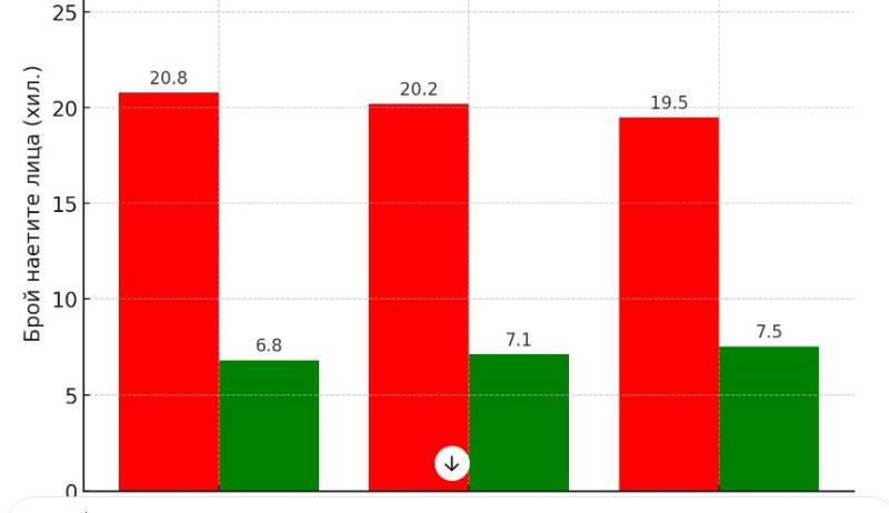 - Частен сектор: Обратно, в частния сектор наетите падат до 19.5 хил. през 2024 г. – спад с 3.5% спрямо 2023 г. (20.2 хил.) и с 6.3% спрямо 2022 г. (20.8 хил.). Това намаление може да е свързано с икономически предизвикателства в ключови отрасли като преработващата промишленост.