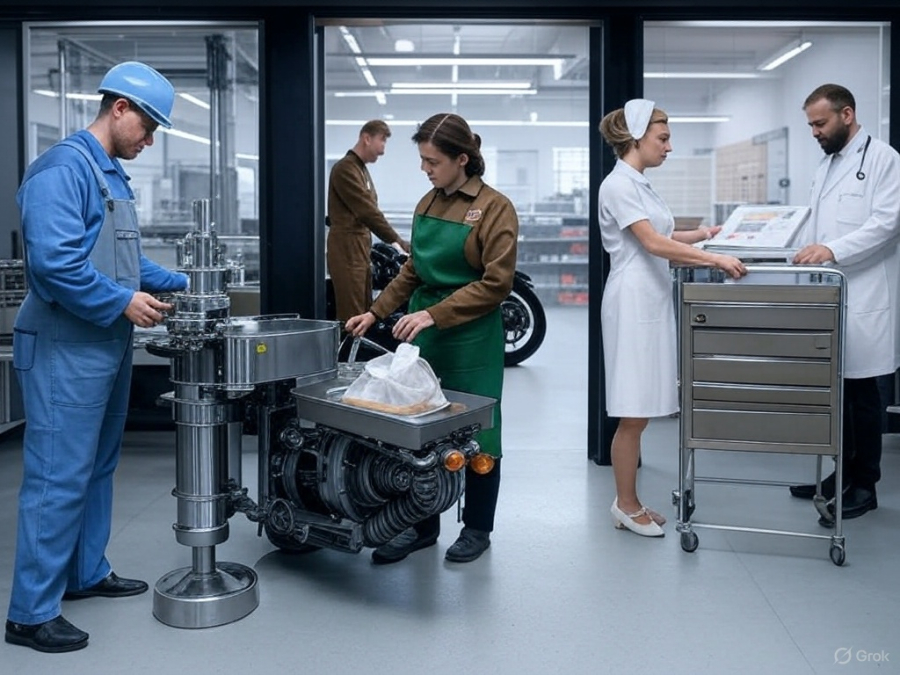 През 2024 г. „Преработващата промишленост“ остава водеща с 26% от наетите, но делът й спада от 28.6% през 2023 г. и 29.8% през 2022 г., което може да обясни част от загубите в частния сектор. „Търговия; ремонт на автомобили и мотоциклети“ запазва стабилни 18% (17.6% през 2023 г., 17.2% през 2022 г.), а „Хуманно здравеопазване и социална работа“ с 10% измества „Образование“ (9.7% през 2023 г., 9.2% през 2022 г.) от челната тройка. Това подсказва преориентация към здравеопазването, вероятно заради увеличението в обществения сектор.