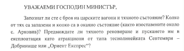 Г-н министър, запознат ли сте с броя на царските вагони...Така започва питането в Парламентарния контрол на депутата от ВЪЗРАЖДАНЕ Никола Димитров от , избран в 31 Ямболски многомандатен район. Да му имахме проблемите...
