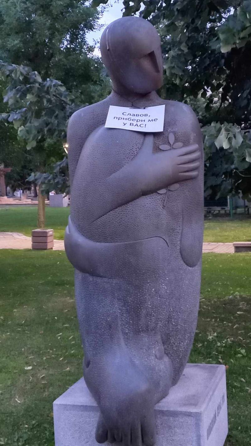 Дали Прокуратурата не трябва да самосезира, за да разкрие, кой е този/тези/, който си е позволил да оскверни този символ, да лепне табелка с надписа "Славов, прибери ме у вас", върху произведението на изкуството, кой се гаври с изтънчените джендър-евротлантически ценности...
