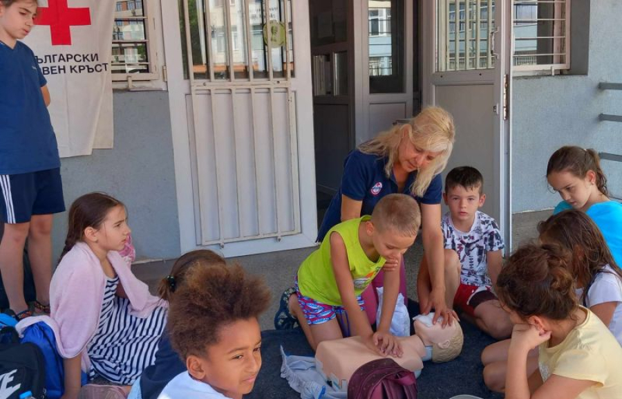 Специалист от Ямболската червенокръстка организация запознава децата с техниките за измерване на основните жизнени показатели – пулс и дишане, подход и последователност на действията към пострадал в безсъзнание, с липса на дишане и сърдечна дейност, поставянето му в странично стабилно положение, след възстановяване на основните жизнени показатели.