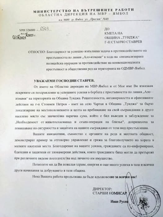От името на Областна дирекция на МВР- Ямбол и от Мое име Ви изказвам искрените си поздравления за успешните усилия в борбата с престъпността по линия на "Ало - измами" на територията на Община "Тунджа".