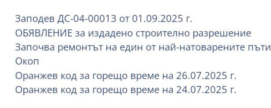 В списъка от актуални дейности на официалният сайт на държавната власт в Област Ямбол отпред освен тази ЗапоДев от 1 септември има и Обявление за издаване на строително разршение.