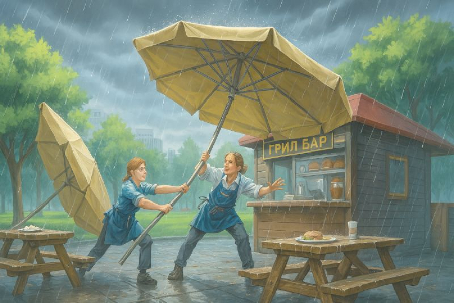 Травмата: При опита да свие един от чадърите, силният вятър противодействал, чадърът паднал и повличал служителката, в резултат на което тя получила счупване на ***.