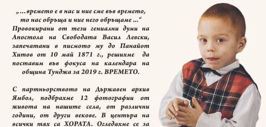 „…времето е в нас и ние сме във времето, то нас обръща и ние него обръщаме“ Провокирани от тези гениални думи на Апостола на Свободата Васил Левски, запечатани в писмото му до Панайот Хитов от 10 май 1871 г., решихме да поставим във фокуса на календара на община „Тунджа“ за 2019 г. ВРЕМЕТО.
