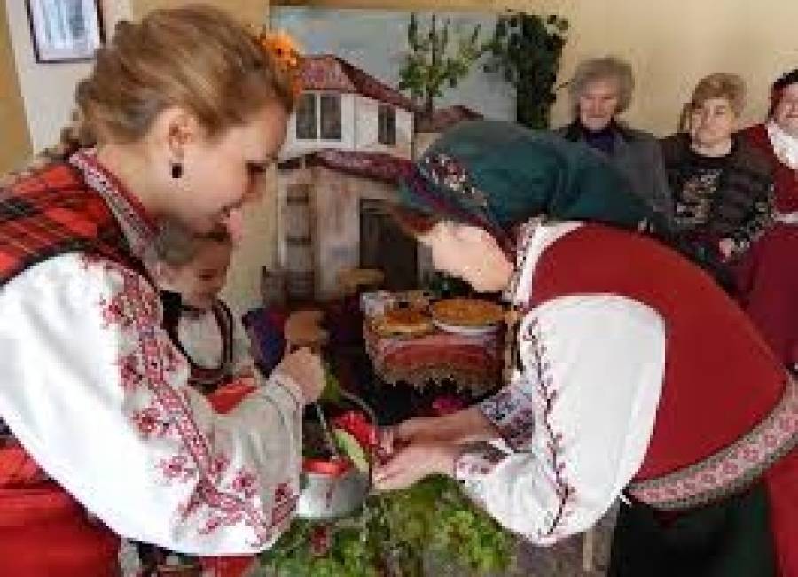 На места бабата, окичена с наниз люти чушки около врата, кади с керемида под полите на жените, за да раждат повече. Пеят се песни за семейството, любовта, честитите майки с многолюдна челяд. Бабата сее с решето просо на софрата, за да са плодовити жените. В началото на трапезата сядат само жени. Чак по-късно идват мъжете и веселието става още по-буйно, с музика, игри и песни.