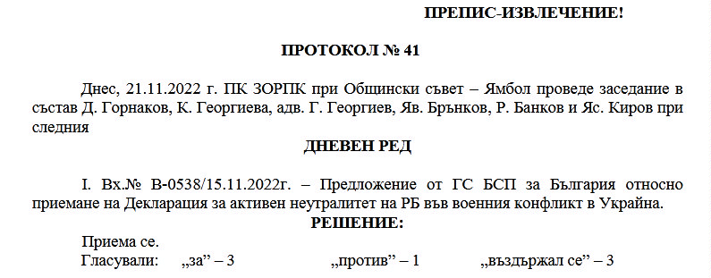 приемане на Декларация за активен неутралитет на РБ във военния конфликт в Украйна.