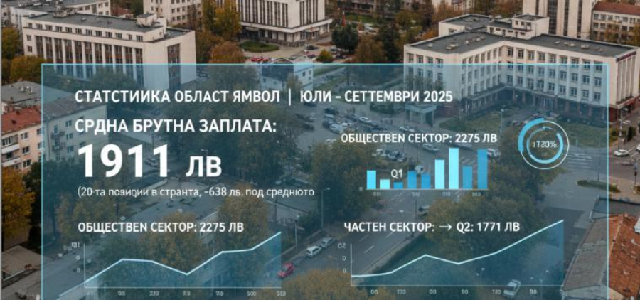 Средната брутна месечна работна заплата в област Ямбол за периода юли – септември 2025 г. е 1911 лв. Тя е с 638 лв. по-ниска от тази за страната като цяло, което отрежда на региона 20-та позиция по този показател, съобщиха от Отдел "Статистически изследвания – Ямбол“ към Териториално статистическо бюро - Югоизток.