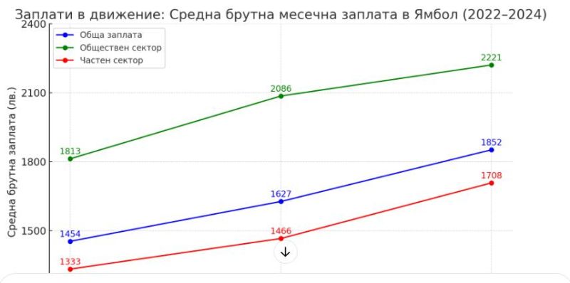 - Обществен сектор: Заплатите тук достигат 2221 лв. през 2024 г., ръст от 6.5% спрямо 2023 г. (2086 лв.) и 22.5% спрямо 2022 г. (1813 лв.). Това отразява засилена държавна подкрепа за сектори като образование и здравеопазване.