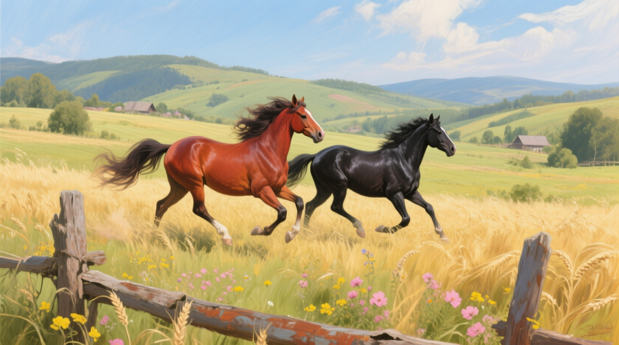 Васил беше докарал от пазаря две млади кобилки. Отвързаха ги от каруцата и ги пуснаха в харманя, празен по това време и обграден с висок дувар. И двете кобилки бяха още неопитомени, току-що хванати с ласо от стадото им, навикнали на свобода, диви. Чичо Митуш и слугите гледаха иззад вратника и не само се любуваха на кобилките - те наистина бяха хубави, - но и с опитно око откриваха ту една, ту друга черта от нрава им. Едната беше червена и се казваше Айа (родена през май), а другата - черна, тя нямаше име. Всяка беше вързана за шията с по едно ново въже, което се влачеше по земята. Нищо друго - ни юлар, ни юзда, ни хамут не беше слагано на тях. Копитата им не бяха подковани, израснали прекомерно, спитенн. Гъстите им опашки досягаха земята.